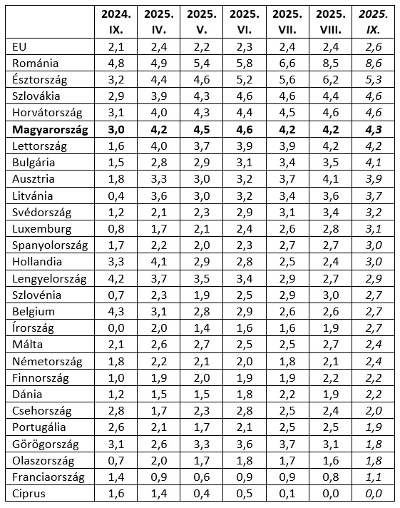 Az augusztusi 2,4 százalék után átlagosan 2,6 százalék volt az éves infláció az Európai Unióban 2025. szeptemberben, a 4,3 százalékos magyar ráta az ötödik legnagyobb.