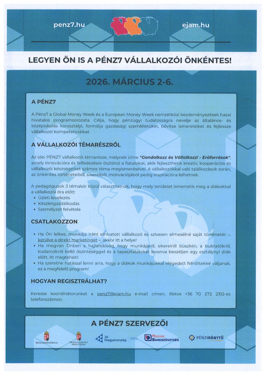 2026. március 2-6. között megrendezésre kerülő PÉNZ7 Pénzügyi és Vállalkozói Témahétre lelkes, munkája iránt elhivatott vállalkozók jelentkezését várják.