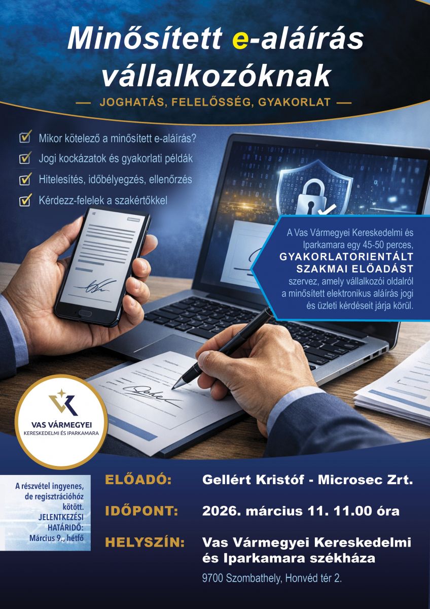 Amit egy cégvezetőnek és döntéshozónak tudnia kell az üzletileg biztonságos elektronikus aláírásról. Az előadás célja, hogy a résztvevők tisztán lássák, mikor van szükség minősített e-aláírásra,mit jelent a „vállalkozónak minősített” aláíró jogi értelemben és hogyan alkalmazható mindez biztonságosan a napi üzleti gyakorlatban.