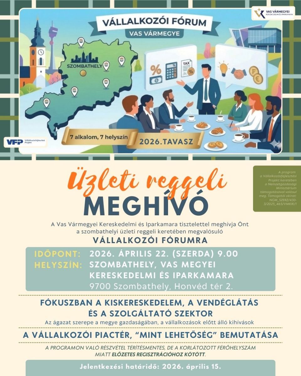 Rendezvény helyszíne: Szombathely, Vas Megyei Kereskedelmi és Iparkamara (Szombathely, Honvéd tér 2.)